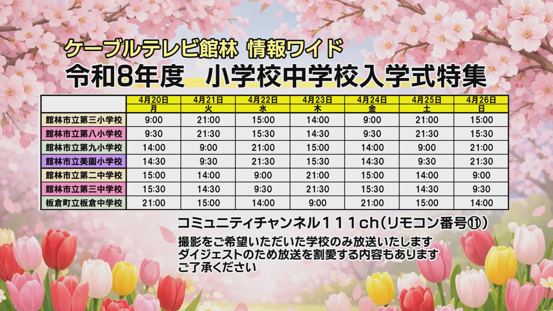 ケーブルテレビでは、「令和8年度 入学式特集」を下記の通り放送いたします。