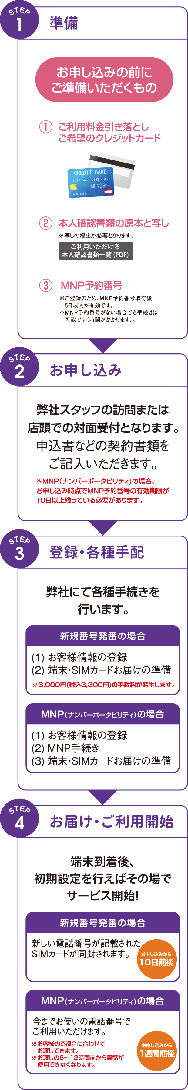 □お申込み時は携帯電話不正利用防止法に基づく本人確認のため、運転免許証などの本人確認書類が必要です。