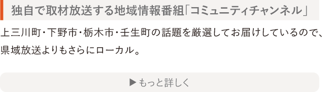ケーブルテレビの地域情報番組「コミュニティチャンネル」では、地域の話題や暮らしに役立つ情報を毎日お届けしています。地域のお店やイベント、サークル、学校行事などを取材しているので、もしかしたらあなたのところにもおじゃまするかもしれません。